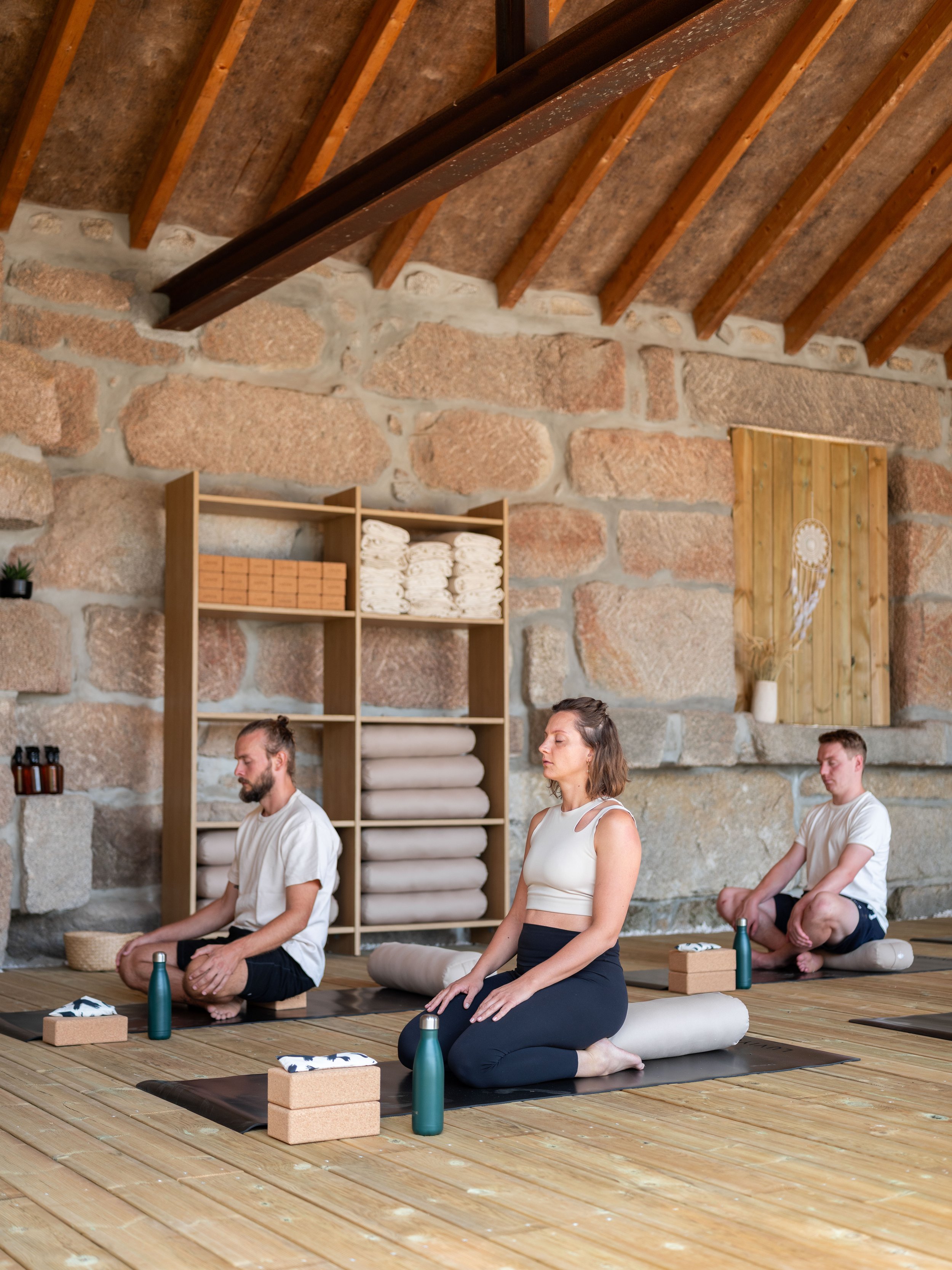 The half-open yoga shala overlooks the valley. Calm and open, it is designed for focused practice, giving the space a unique atmosphere. Fully equipped with high-quality props, it offers everything needed for a grounded and well-supported experience.